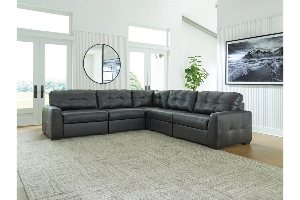 Experience the perfect blend of comfort and style with the Brindley Pier 5-Piece Sectional in Fog by Signature Design by Ashley. This luxurious sectional combines genuine leather and skillfully matched faux leather to create a sophisticated and inviting seating arrangement. The tufted detailing and low-profile legs add a touch of elegance, making it a standout piece in any living space. Designed for both coziness and visual appeal, this sectional is a must-have for those who appreciate quality and design.