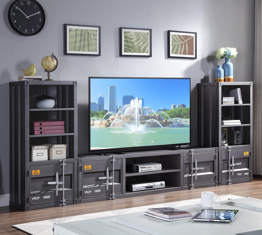 Anchor your entertainment space in effortless style with the Cargo entertainment set. The impressive design elements mix contemporary and industrial themes into one impressive transitional look. The TV stand and 2 side piers feature a unique fun finish with metal accents that will revitalize any space. With multiple storage compartments and open media shelves, there is plenty of space for your media components and collectibles.