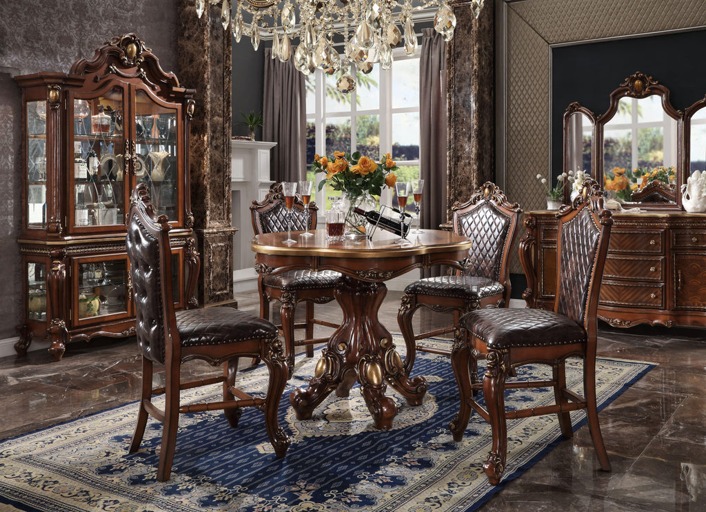 - Exclusive Design - Round Pedestal Table - Fixed Top (NO Extension) - Wooden Frame, Poly-Resin Raised Scrolled Floral Motifs, Antique Hand-Brushed Finish - Wooden Top in Cherry Oak, Apron & Single Pedestal Base in Antique Pearl Finish -- MATCHING CHAIRS: Padded Seat & Back: PU - Features, Button Tufted (Outside Backrest), Nailhead Trim - Arched Style Backrest - Queen Anne Leg - Matching Hutch-Buffet & Curio Cabinet Sold Separately (Touch Light) - Collection Picardy: Available in Cherry Oak, Bone White Finish